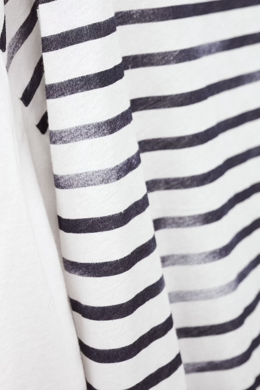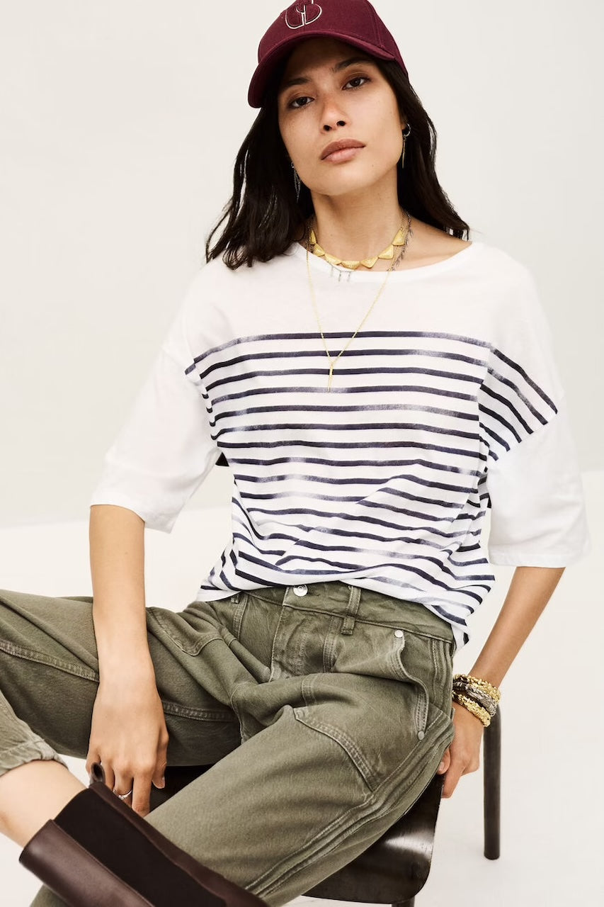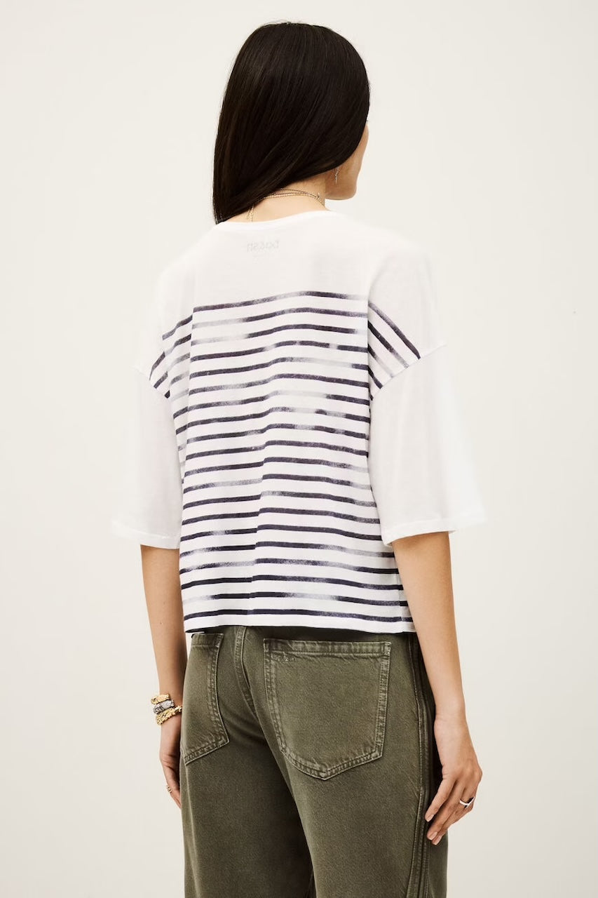 The Bash Paris Crysbo Tee is a timeless wardrobe staple with a relaxed, effortless feel. Designed in a loose cut with a flattering boat neckline, it features elbow-length sleeves and a vintage-inspired striped print on both front and back. Crafted from Supima cotton sourced from organic farming, this tee is exceptionally soft to the touch while offering lasting quality. A chic everyday piece that pairs perfectly with denim, skirts, or under your favourite blazer.