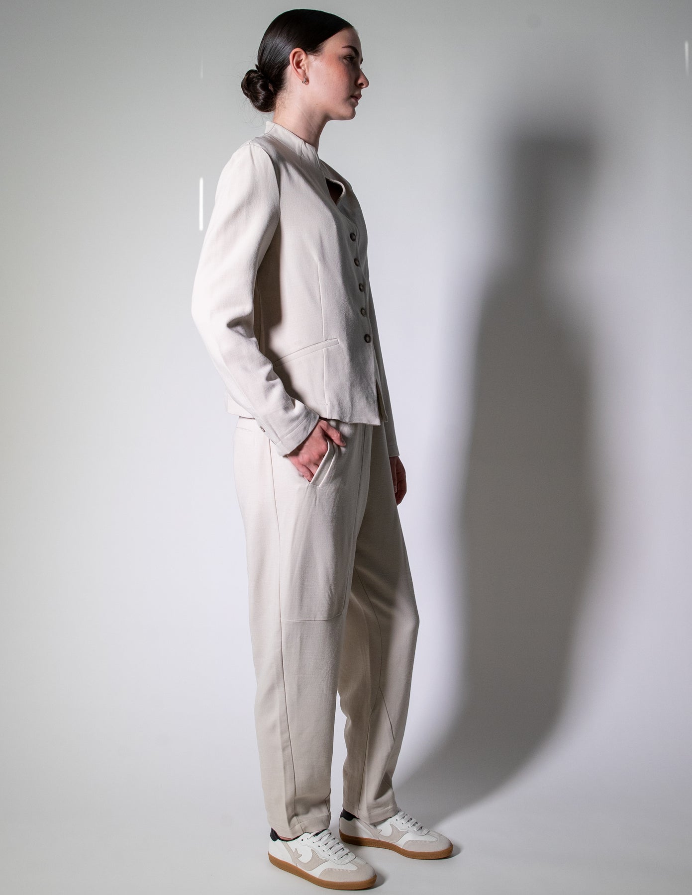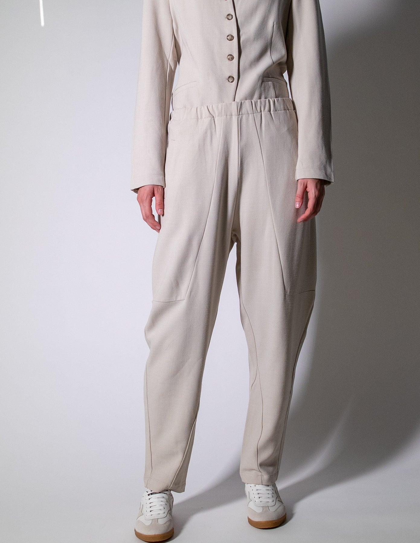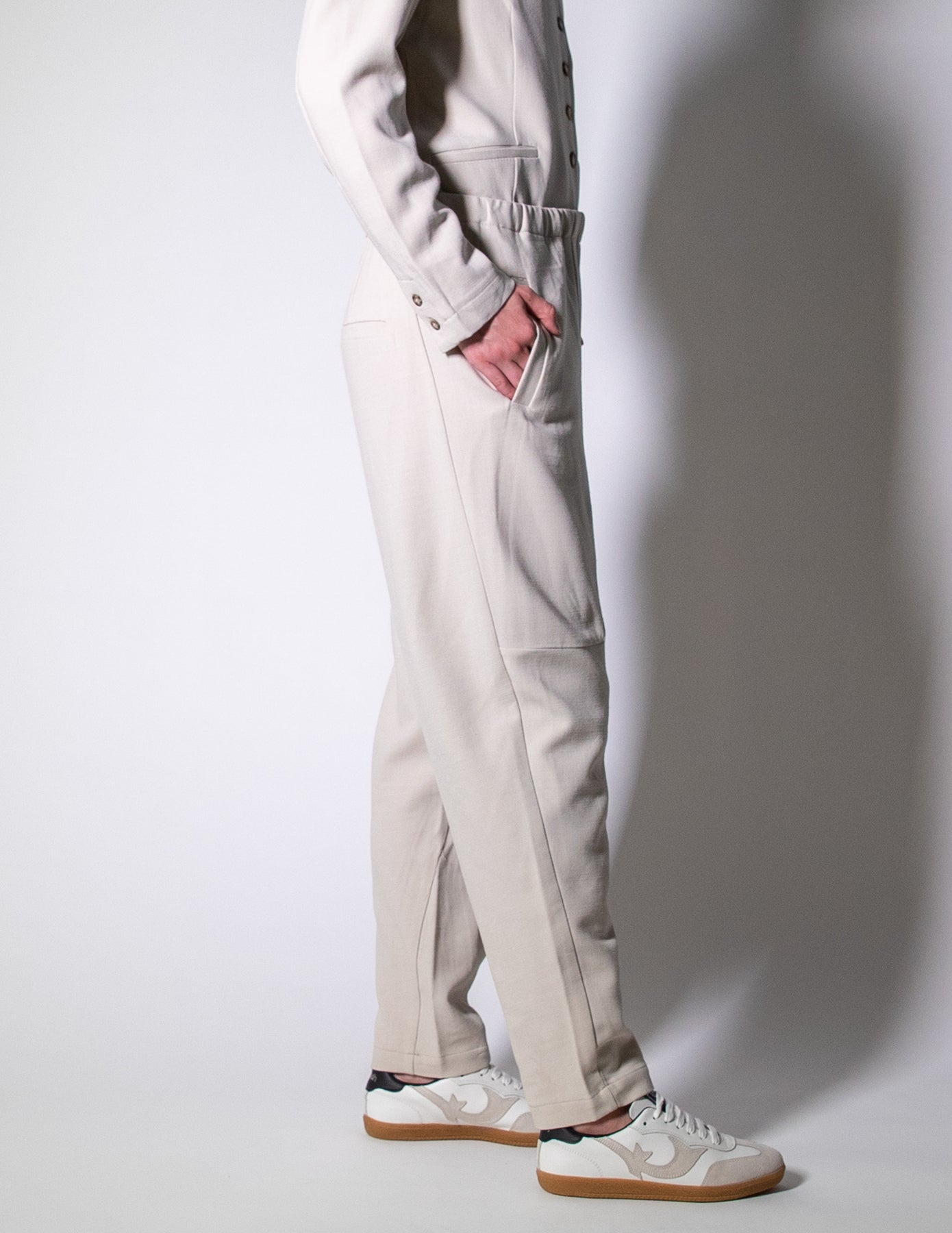 Angled front pockets and modern panel detailing add subtle structure, while the tapered leg creates a clean, flattering line. Crafted in Italy from a soft, stretch wool blend, they offer warmth, flexibility, and refined ease.