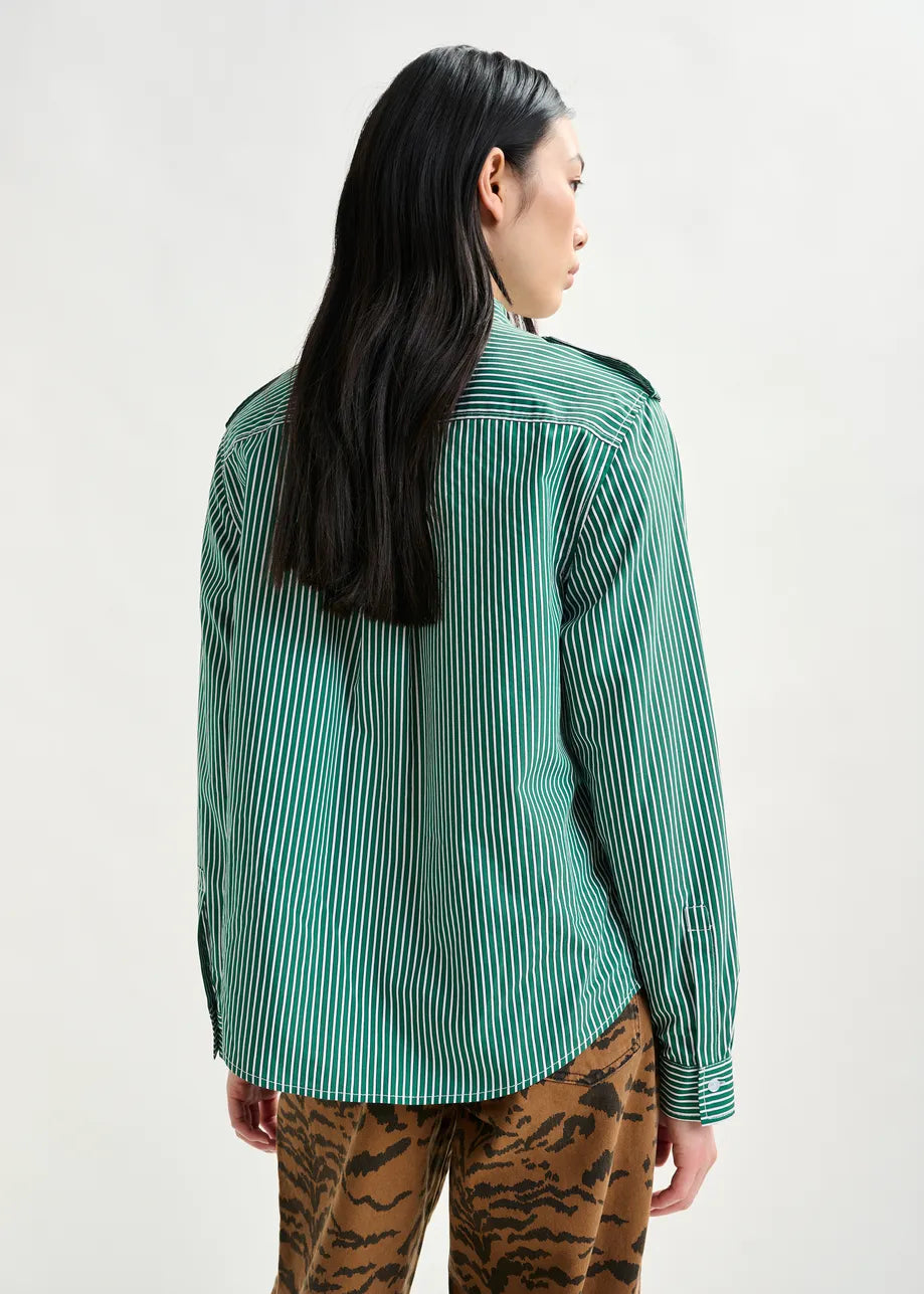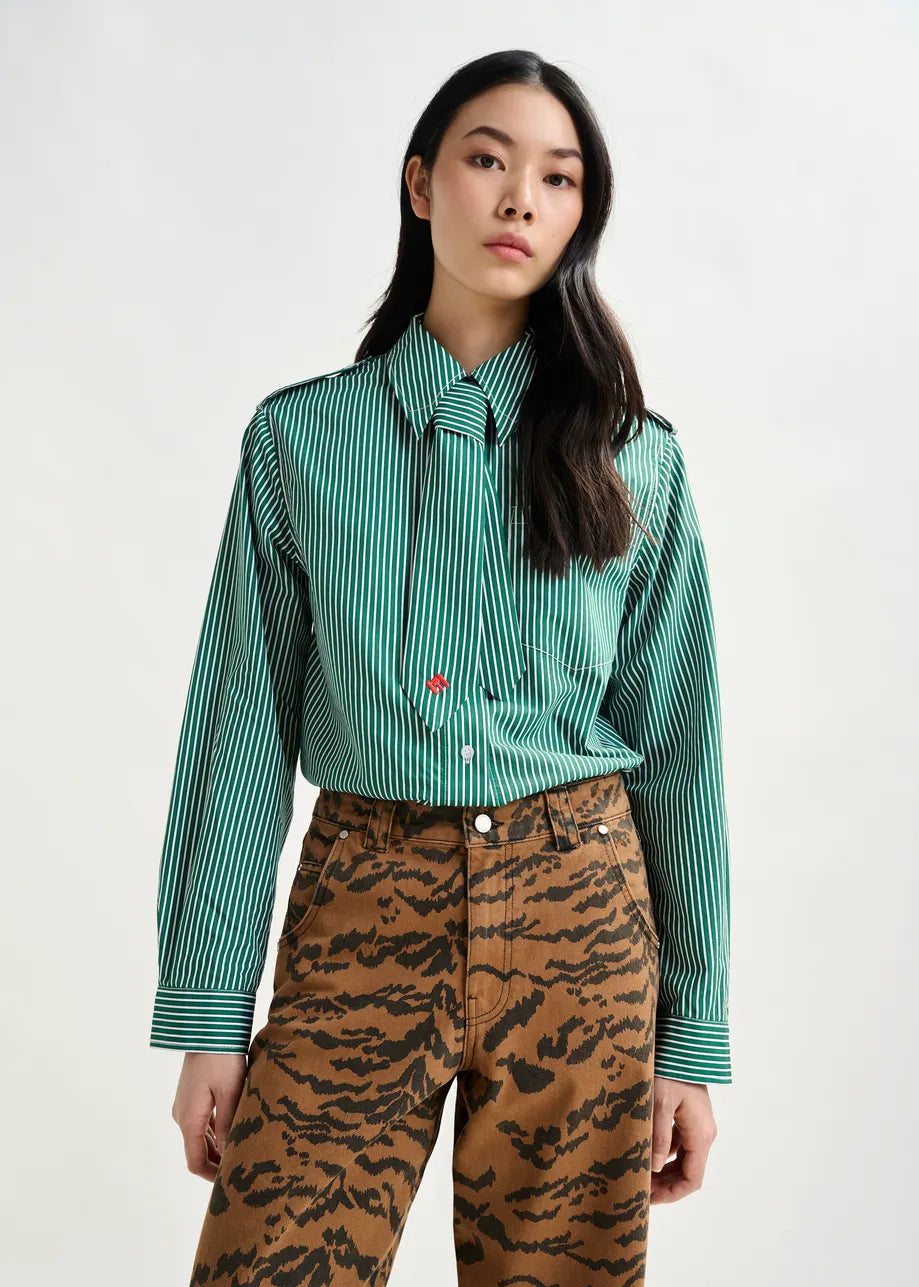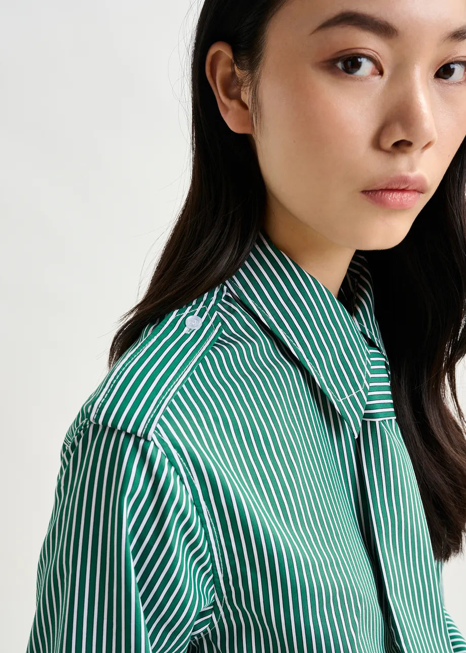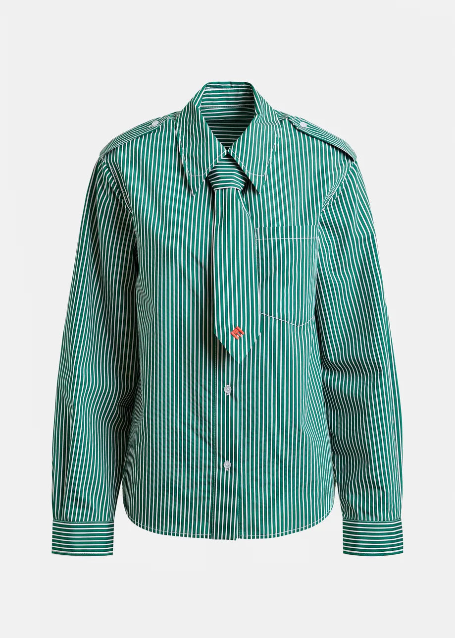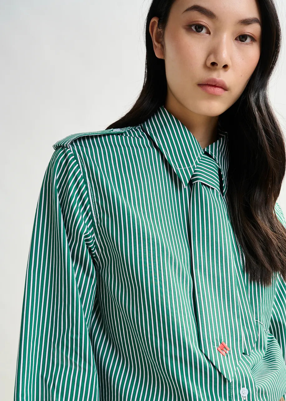 A fresh twist on a classic silhouette, the Igold Top by Essentiel Antwerp brings playful sophistication to your everyday wardrobe. Crafted from a crisp cotton-blend fabric, this boxy shirt features dropped shoulders and a softly rounded hemline for a relaxed, contemporary feel. The design is elevated with shoulder straps and button detailing, a removable bow tie for a charming touch, and a single chest pocket for timeless appeal.