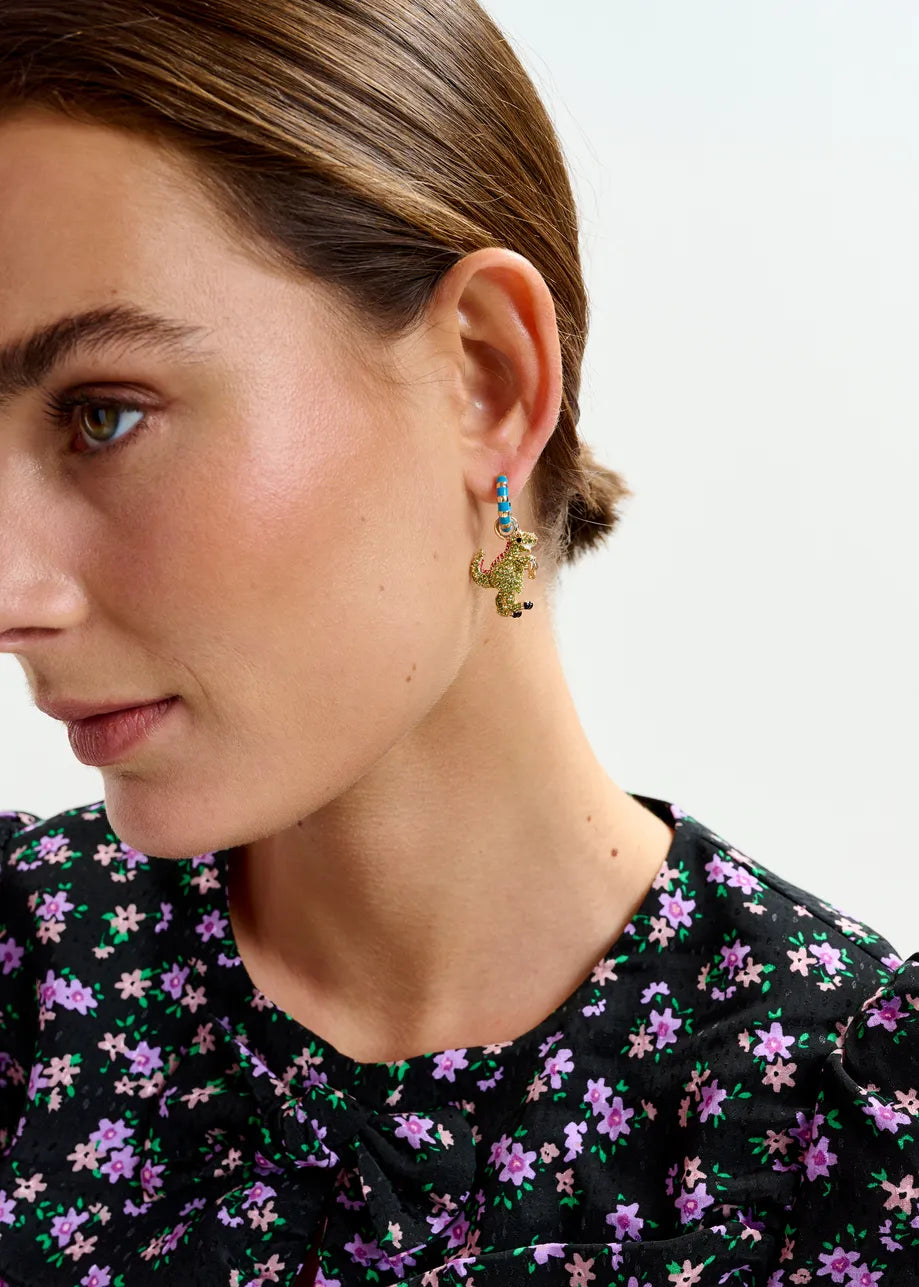 Armed and dino-rous! These Ihotti Earrings from Essentiel Antwerp bring playful energy to your look with their fun, mismatched design. One hoop features a rhinestone-encrusted dinosaur, while the other showcases a colourful enamel water gun pendant. Bursting with personality and sparkle, they’re the perfect finishing touch for any bold outfit.