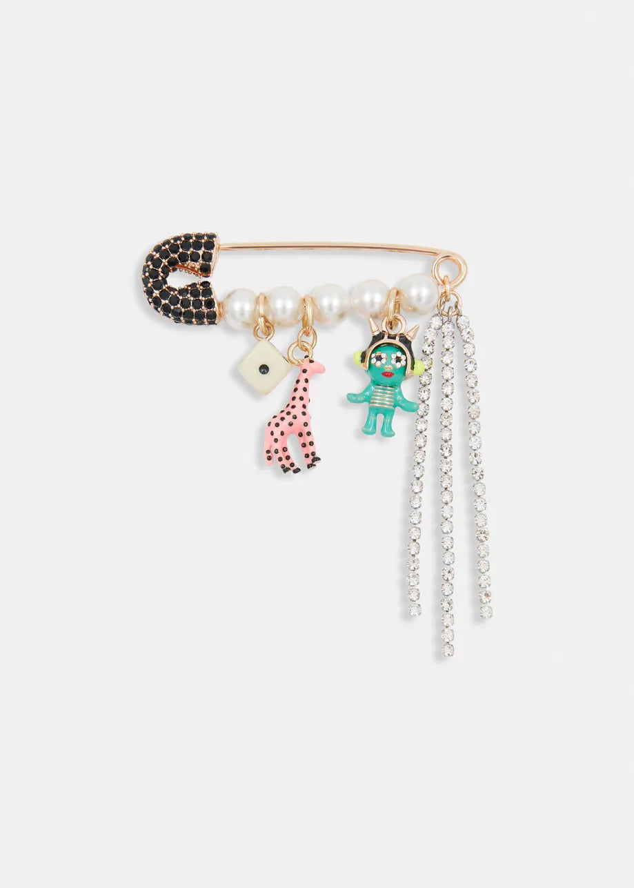 Bring a playful edge to your look with the Imora Brooch by Essentiel Antwerp. Designed as a charm-adorned safety pin, this whimsical accessory features a mix of dangling pendants—including a giraffe, dice, and alien—each detailed with enamel, pearls, and rhinestones for a touch of shimmer and fun. Crafted from gold-tone hardware, it’s a statement piece that perfectly balances elegance with eccentric charm.