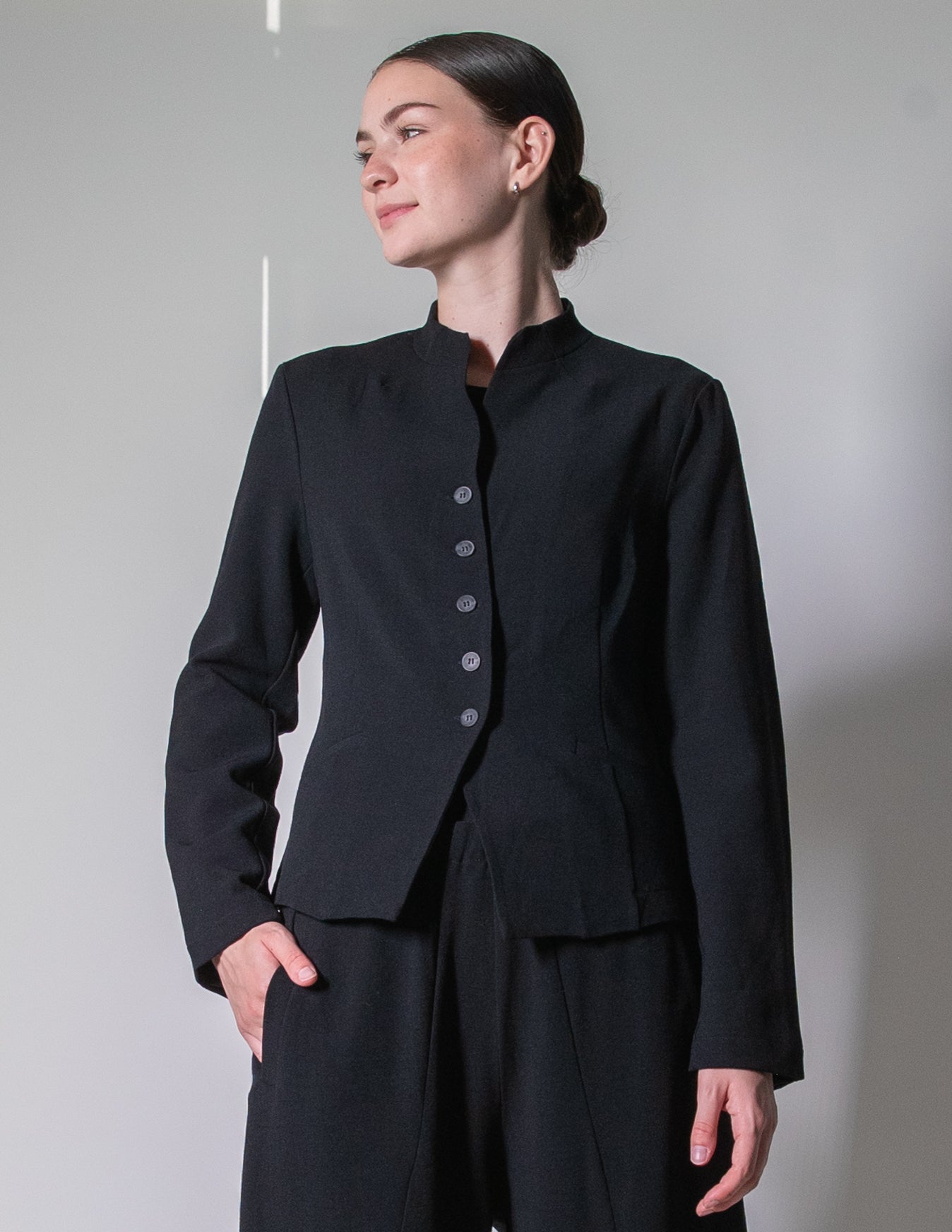 Timeless tailoring meets effortless comfort in the Transit Par-Such Wool Blend Jacket. Designed with a flattering fitted silhouette, this refined piece features a button-front closure, a sleek small inverted round collar, and front side seam pockets for a clean, modern finish.