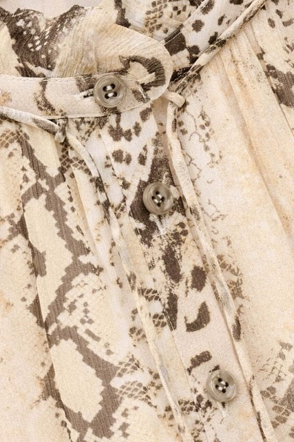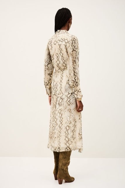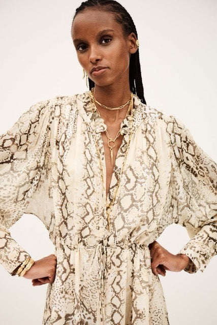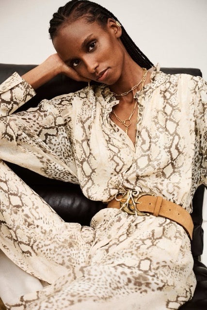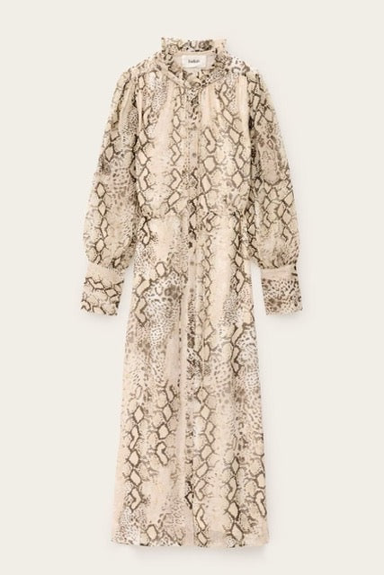 The Bash Paris Sahara Dress is a striking, flowy silhouette designed for effortless elegance. Featuring a fitted waist with a gathered tie and a button-front fastening, it offers a flattering, adjustable fit. Long sleeves with fitted cuffs and subtle gathering at the shoulders add refined structure, while the mixed animal print pattern brings a bold, contemporary edge.