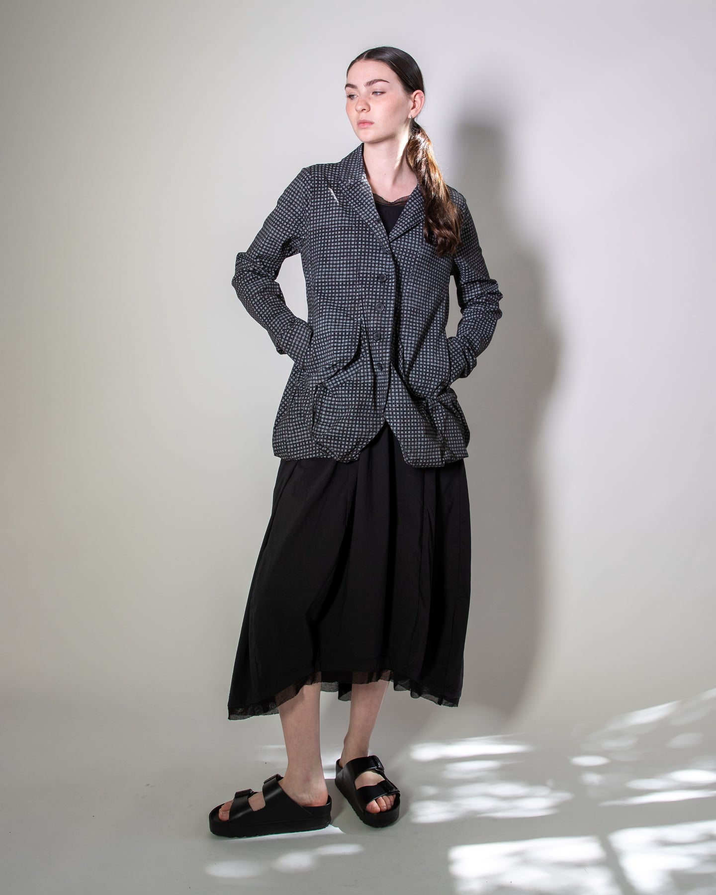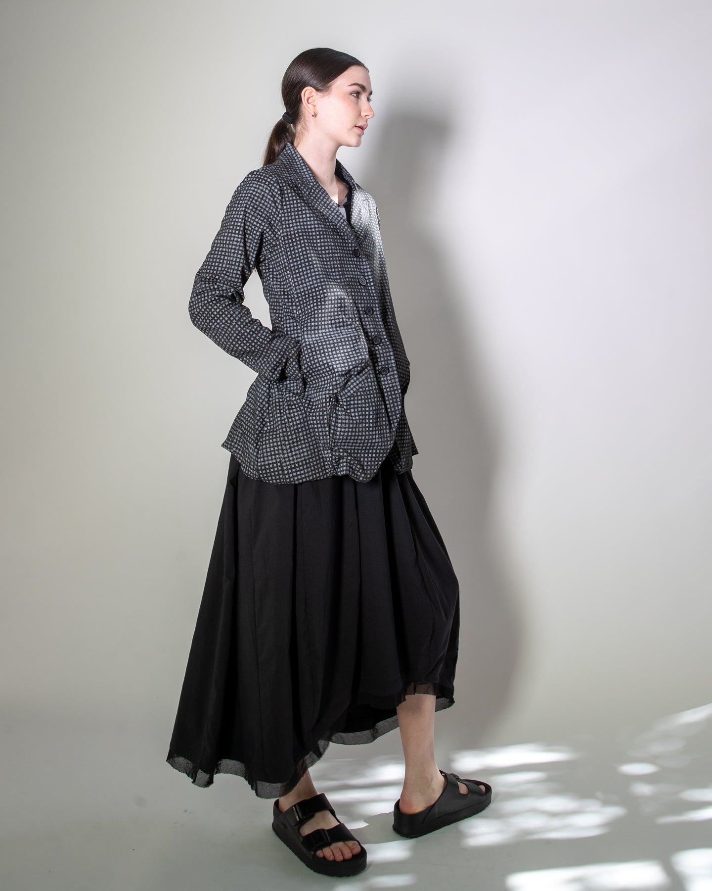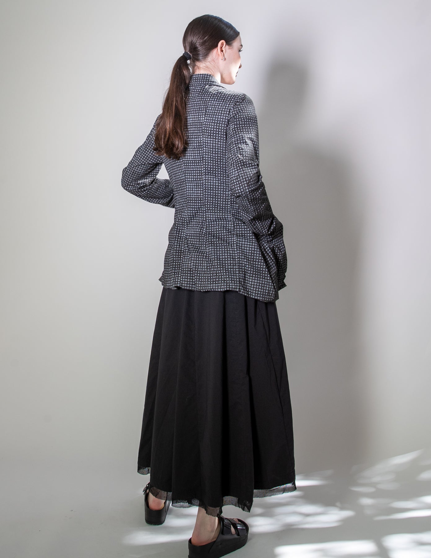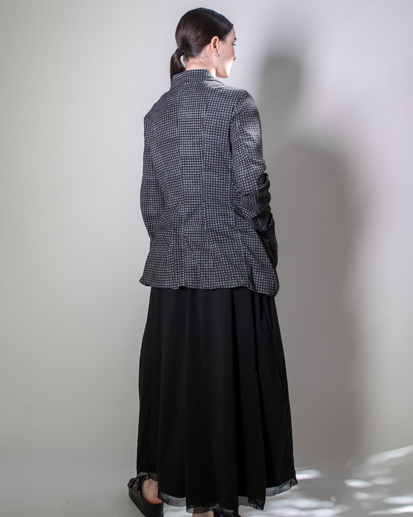 The Rundholz Black Label Check Jacket blends avant-garde detailing with everyday wearability. Designed with rear inverted seams, it creates a striking fluted effect that adds both volume and sculptural shaping to the silhouette.