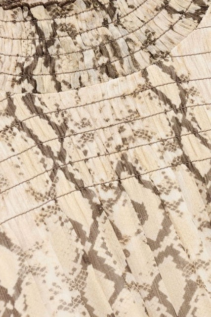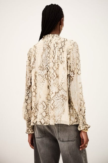 The Bash Paris Shamy Blouse is a bold, elegant statement piece with a flowing silhouette and striking snake print. Designed with a high neckline and long puff sleeves, it combines structure and movement for a refined, feminine look. Smocked details at the cuffs and back add texture, while gathered sleeves enhance the soft, romantic shape. Fully lined for comfort (except sleeves), this blouse drapes beautifully for all-day wear.