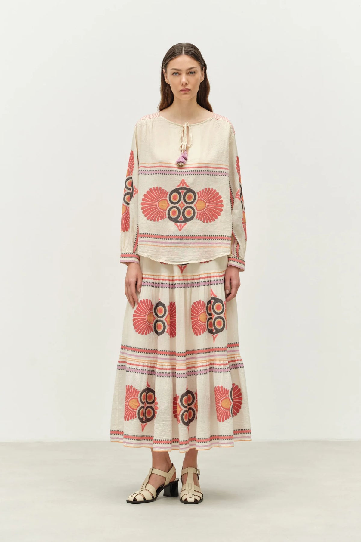 The Devotion Twins Dilos Blouse is a timeless piece infused with bohemian elegance. Crafted from pure cotton in a beautiful jacquard print, this straight-cut blouse features a refined binding on the collar and a flattering V-neckline with a tasselled cord tie. The long sleeves with button closures add a touch of sophistication, making it perfect for both casual days and elevated occasions.