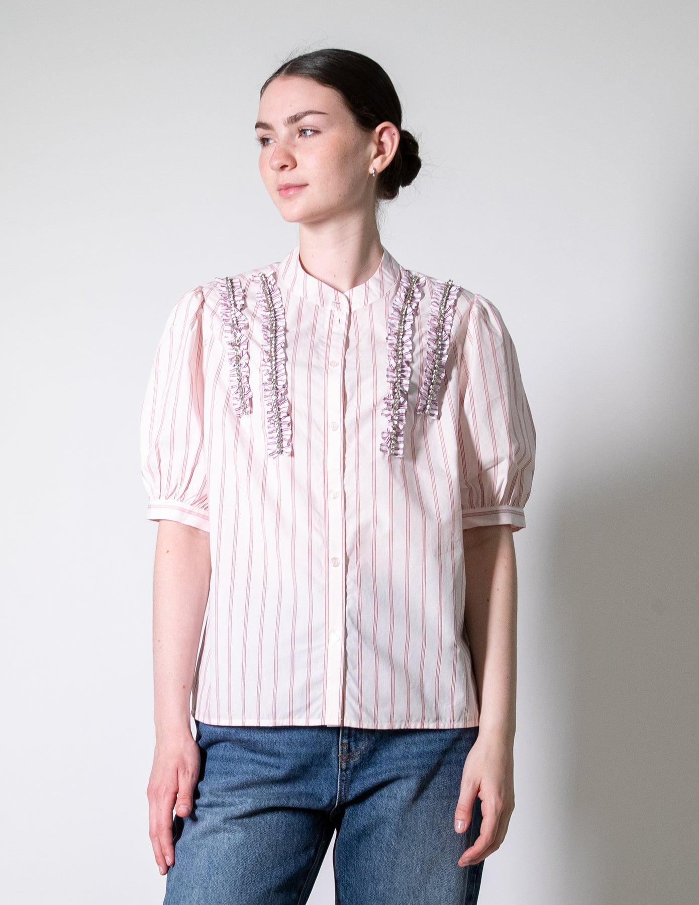 The Essentiel Antwerp Ifrill Shirt delivers effortless sophistication with a playful twist. Crafted from crisp 100% cotton, this short-sleeve shirt features delicate frill detailing along the front, adding a soft feminine touch to its clean silhouette. The button-front closure keeps the look polished, making it perfect for both smart and casual occasions. Style it tucked into tailored pants or denim for a refined yet relaxed finish.