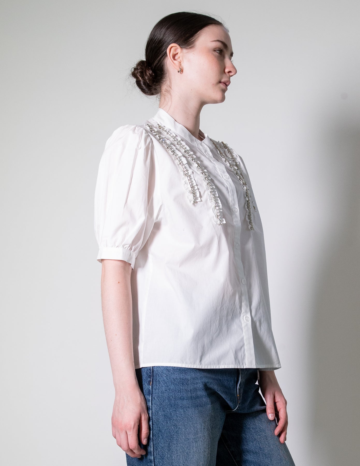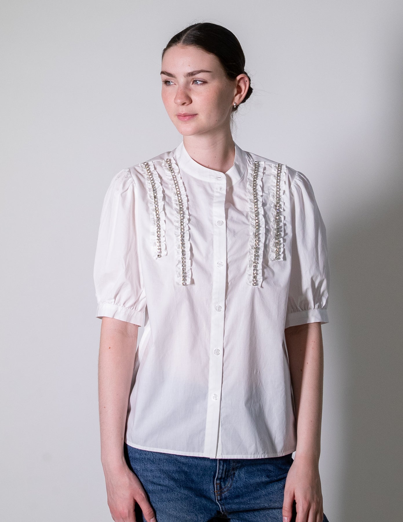 The Essentiel Antwerp Ifrill Shirt delivers effortless sophistication with a playful twist. Crafted from crisp 100% cotton, this short-sleeve shirt features delicate frill detailing along the front, adding a soft feminine touch to its clean silhouette. The button-front closure keeps the look polished, making it perfect for both smart and casual occasions. Style it tucked into tailored pants or denim for a refined yet relaxed finish.