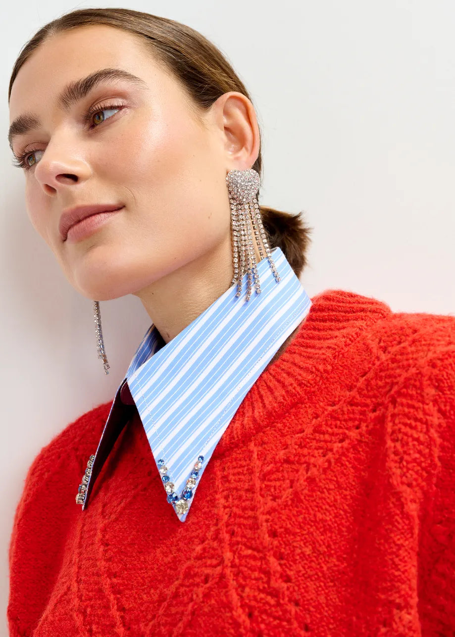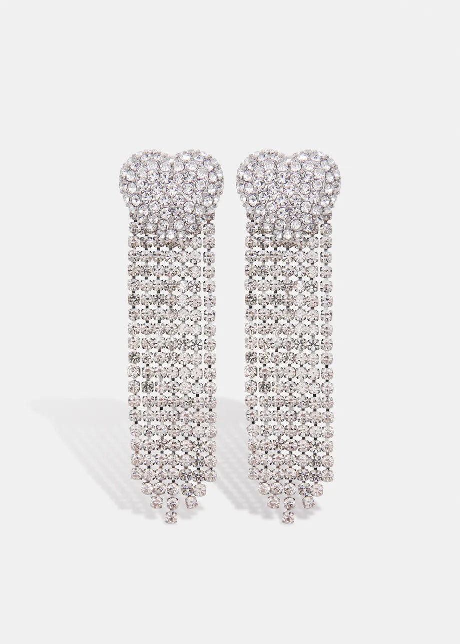 Add instant glamour to your look with the Ilya Earrings from Essentiel Antwerp. These striking heart-shaped earrings are fully encrusted with sparkling glass rhinestones and finished with elegant dangling strands that shimmer beautifully with every movement. Measuring 120 mm in length, they’re the perfect statement accessory for evening wear or elevating a simple outfit with a touch of brilliance.