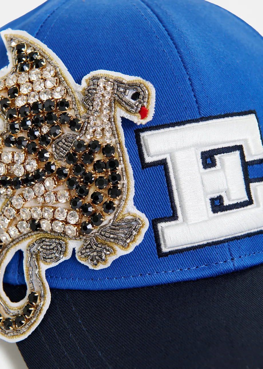 Top off your look with playful polish in the Ivarsity Cap from Essentiel Antwerp. Crafted from sturdy cotton-canvas, this baseball cap features an embroidered bold ‘E’ logo and a rhinestone-embellished bird patch for a signature touch of sparkle. The adjustable Velcro fastening ensures a secure, comfortable fit—perfect for off-duty days or adding a statement twist to your everyday style.