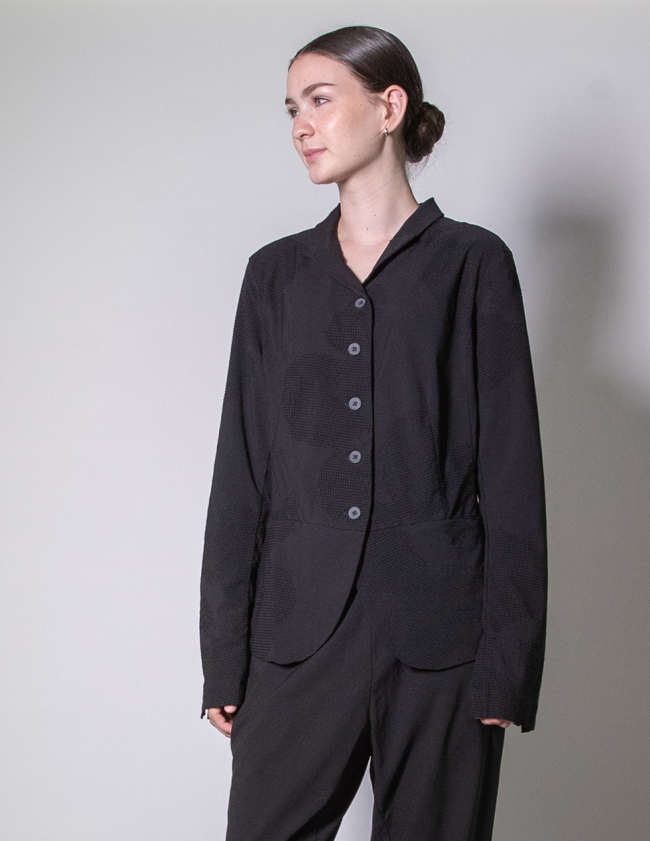 Easy open front pockets add everyday practicality, while the velvet dot flower print brings texture and depth without overpowering the look. Versatile by design, it pairs beautifully with the matching trouser or works just as well as a standout layering piece on its own.