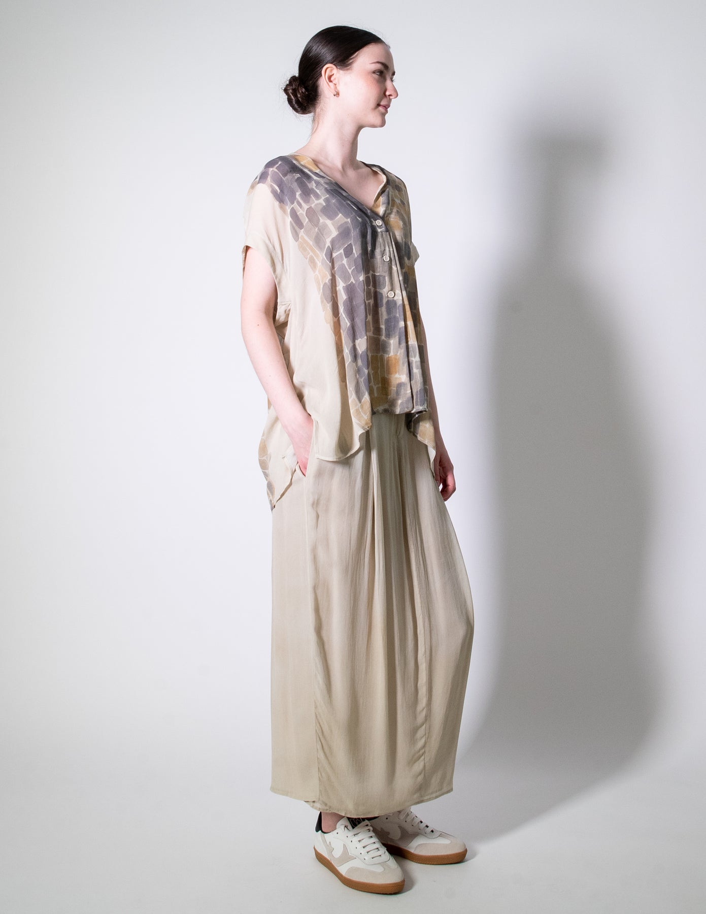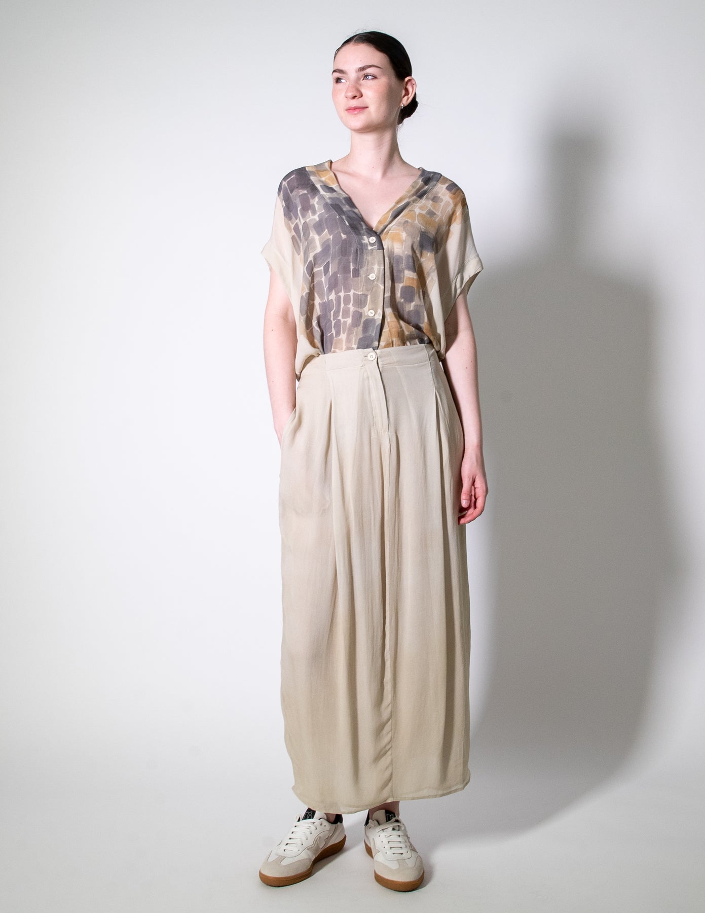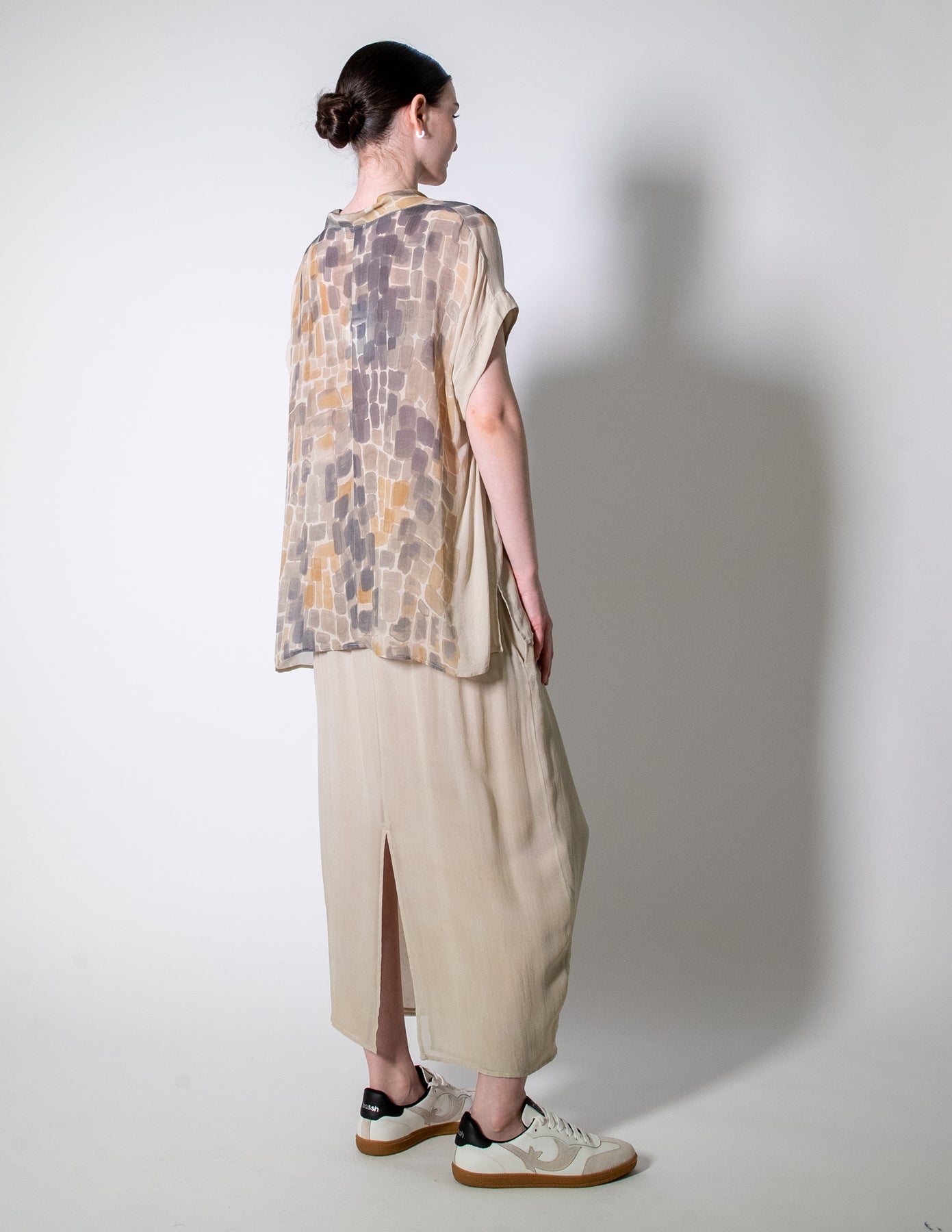 A relaxed viscose shirt featuring an abstract brushstroke print in natural tones. Designed with a V-neckline, button front, and drop sleeves for easy movement. Side splits add a fluid drape and laid-back charm. The perfect piece to pair with the matching skirt or your favourite linen trousers for effortless elegance.