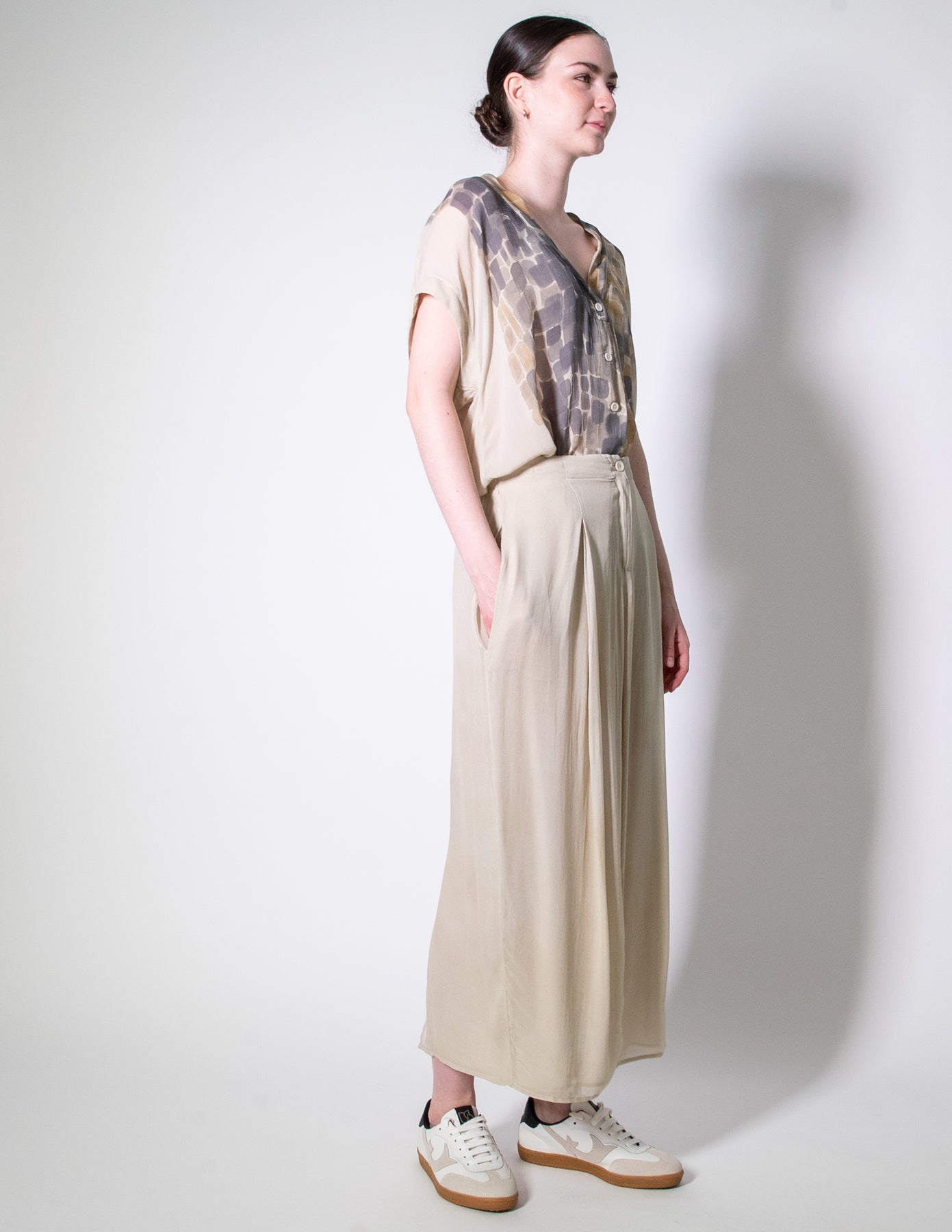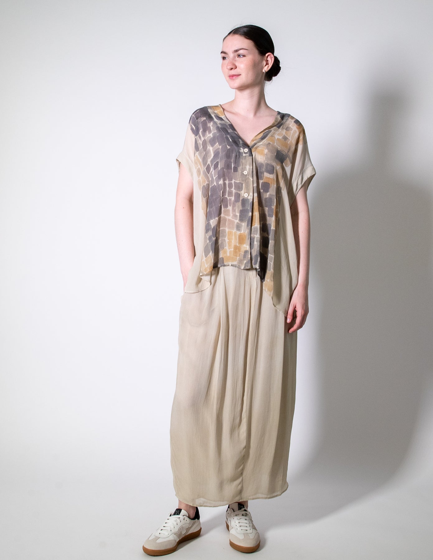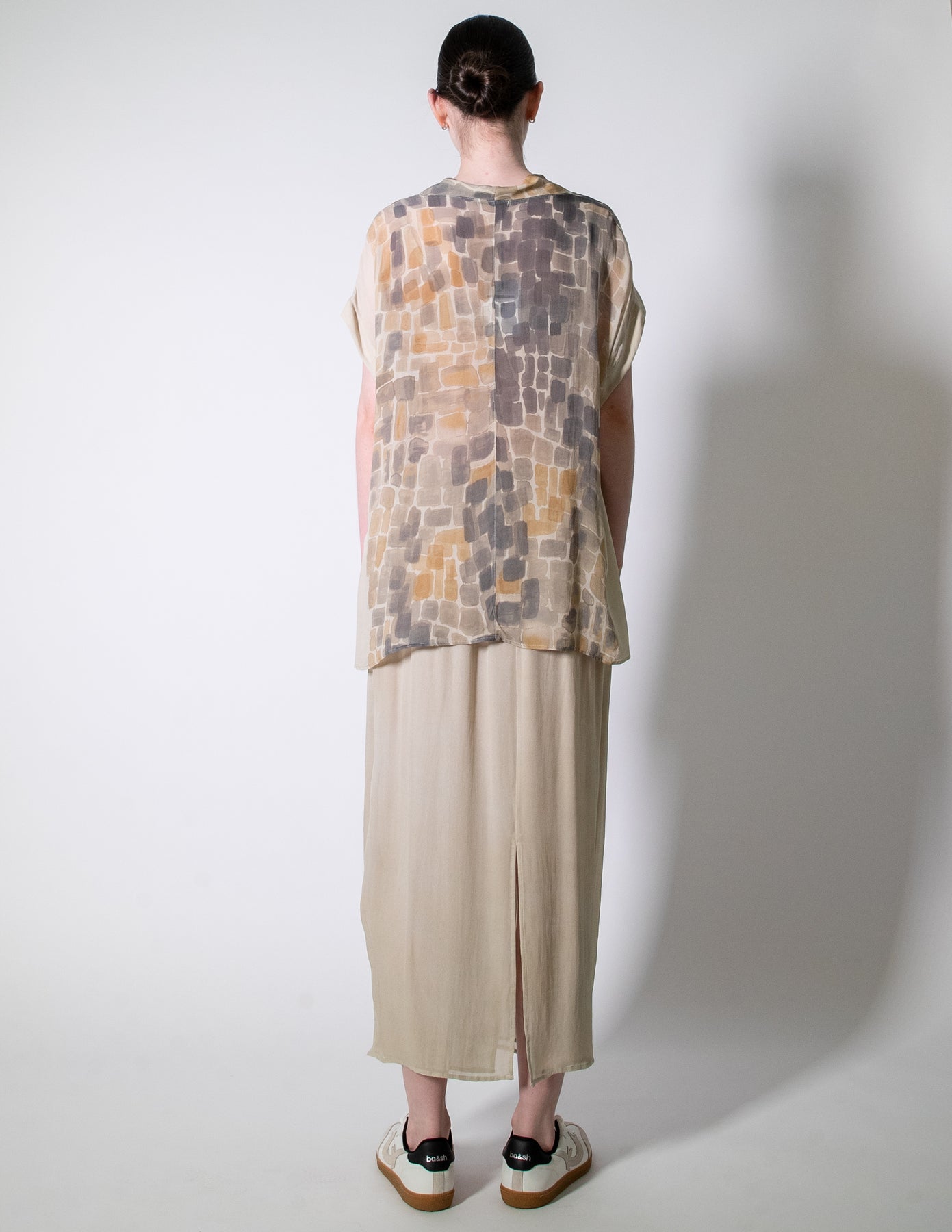 A relaxed viscose shirt featuring an abstract brushstroke print in natural tones. Designed with a V-neckline, button front, and drop sleeves for easy movement. Side splits add a fluid drape and laid-back charm. The perfect piece to pair with the matching skirt or your favourite linen trousers for effortless elegance.