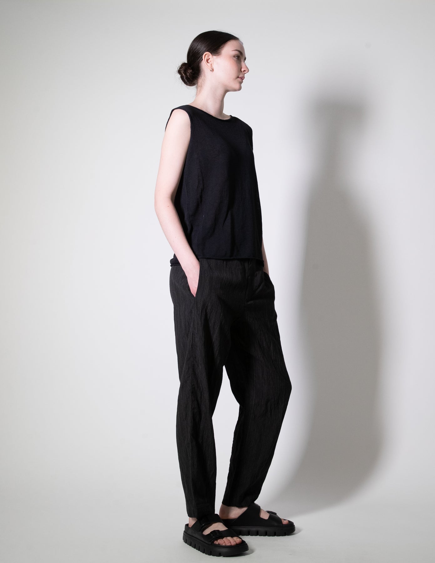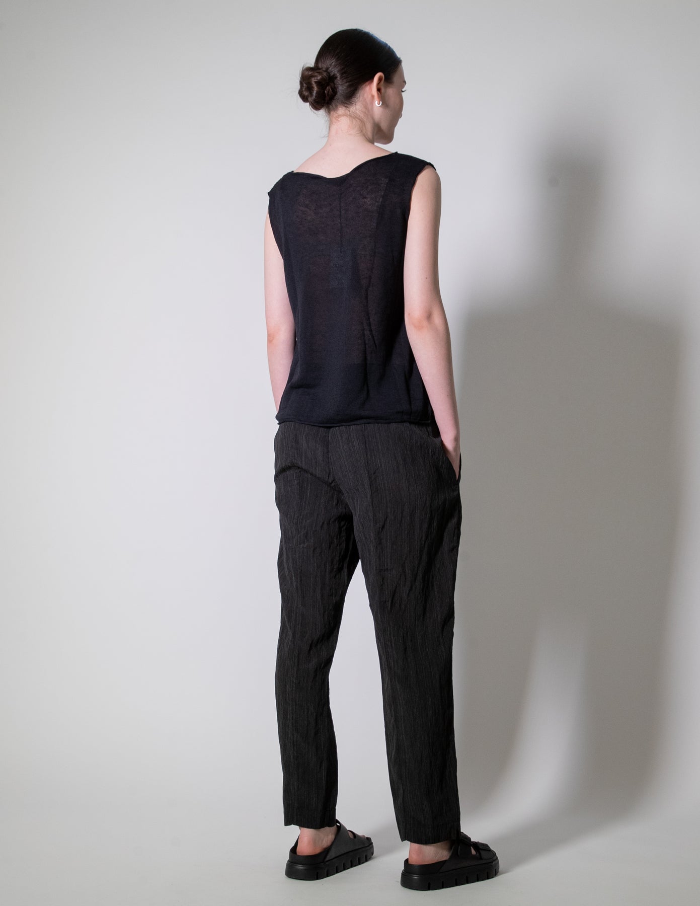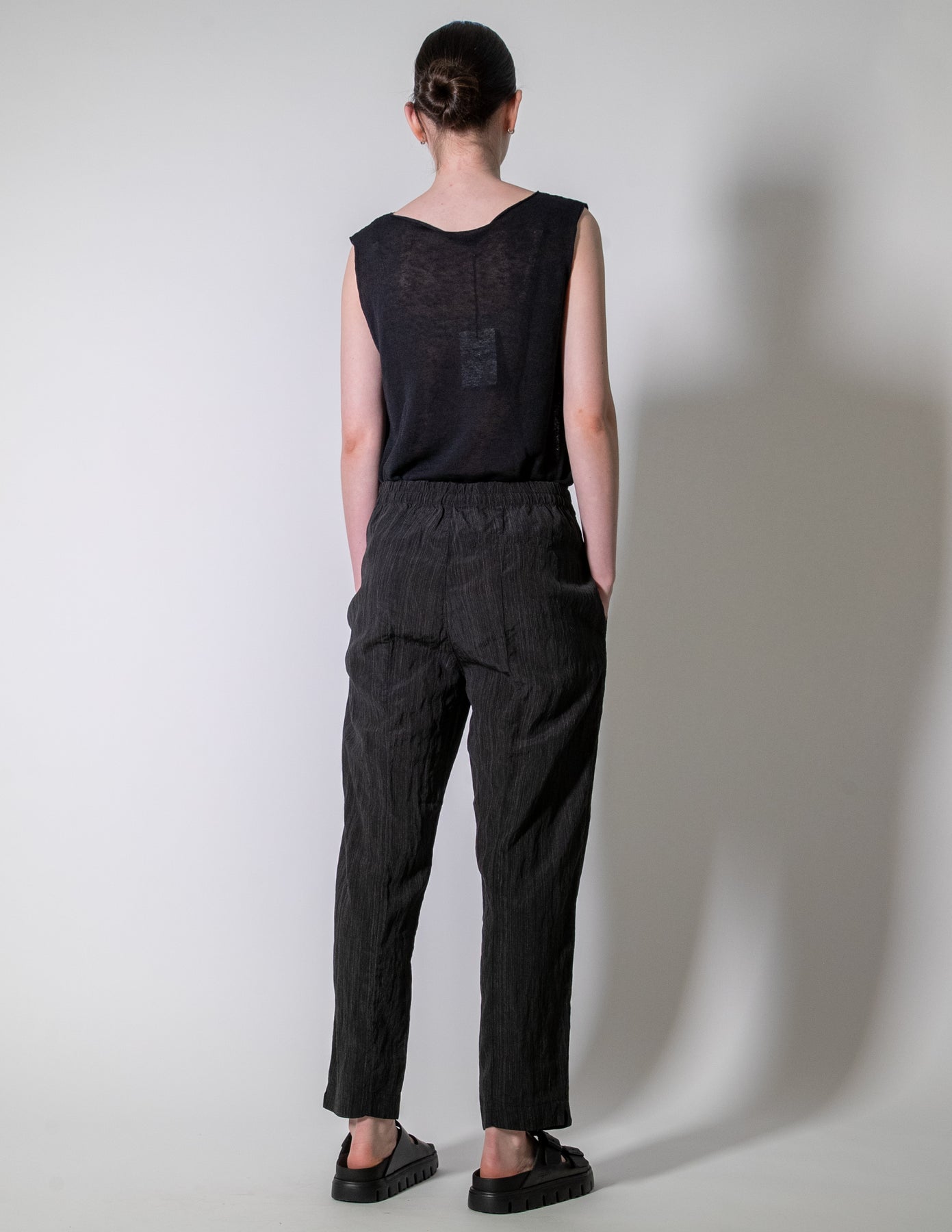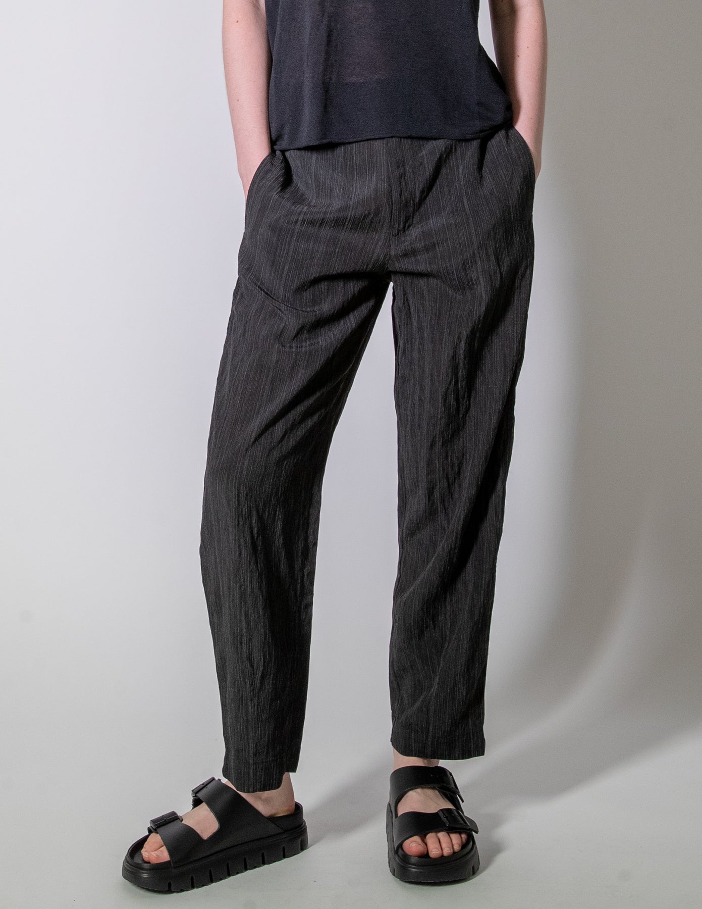 A lightweight self-stripe trouser designed for effortless everyday wear. Featuring a flat front with button fly closure, an elasticated back waistband for comfort, and a tapered leg that flatters while maintaining a relaxed fit. Finished with side pockets and crafted from a softly textured viscose blend for easy movement and a polished look.