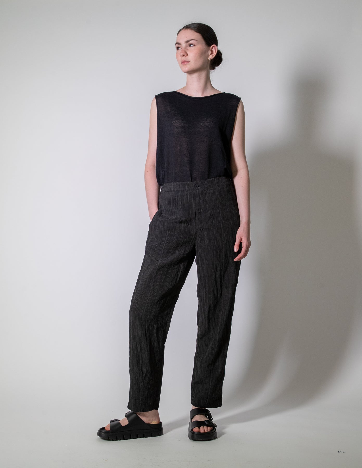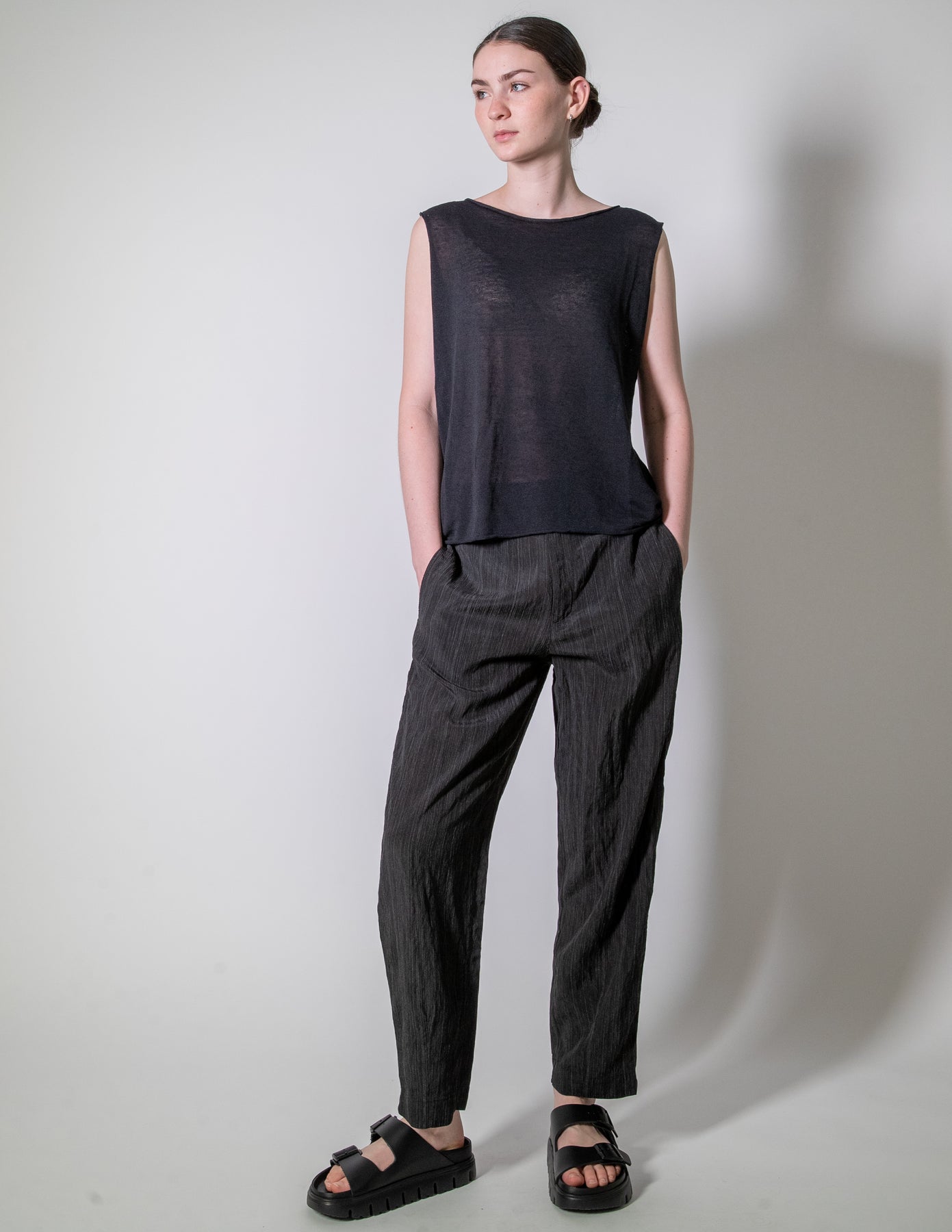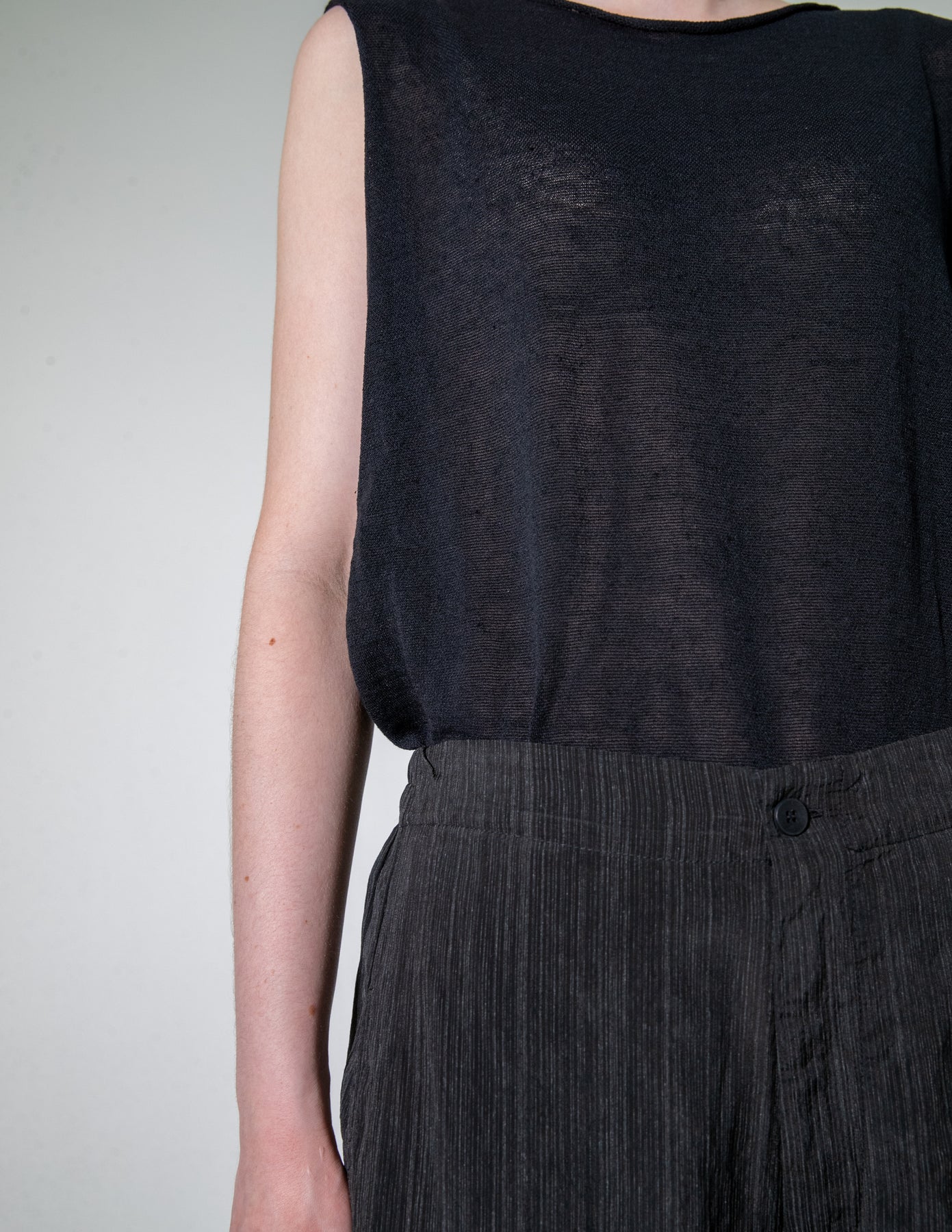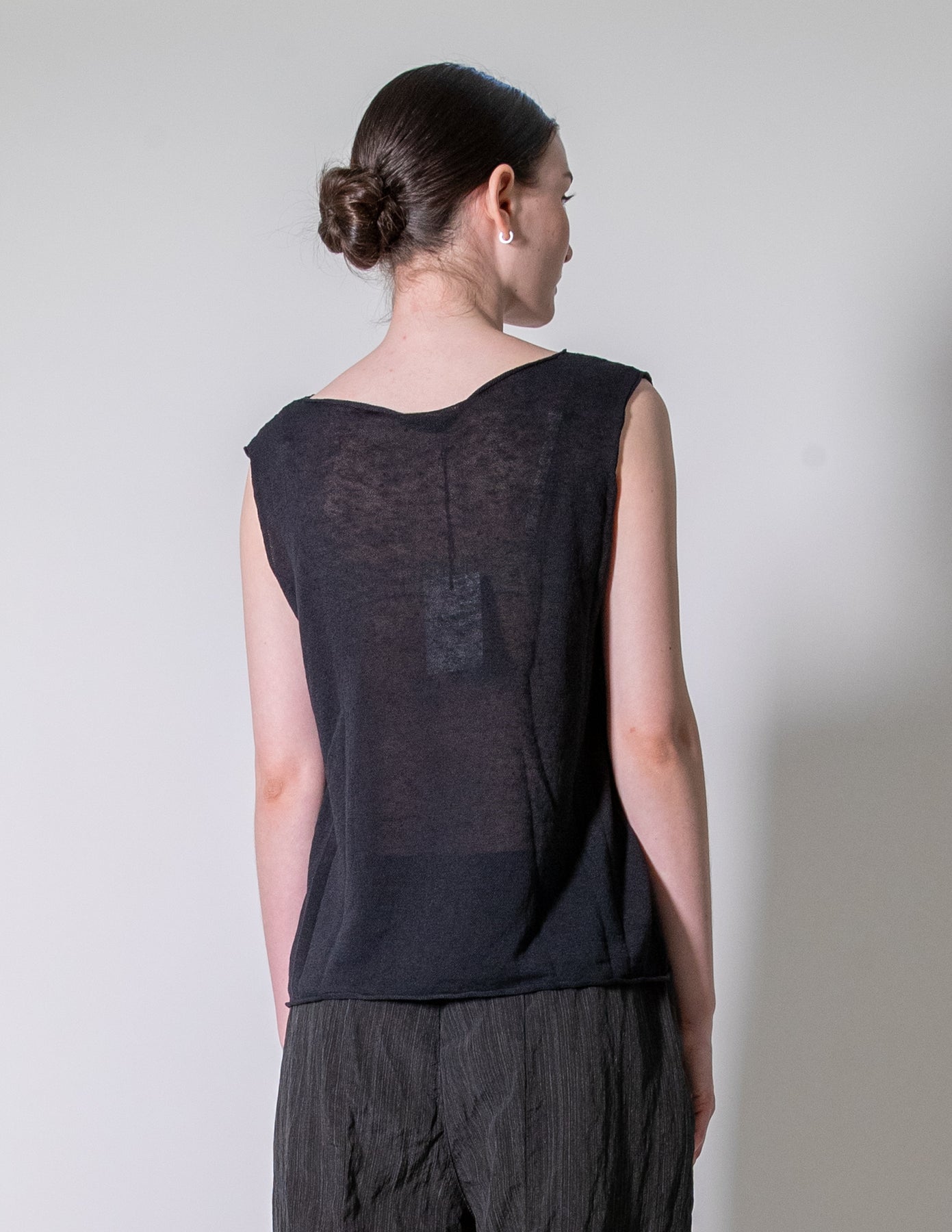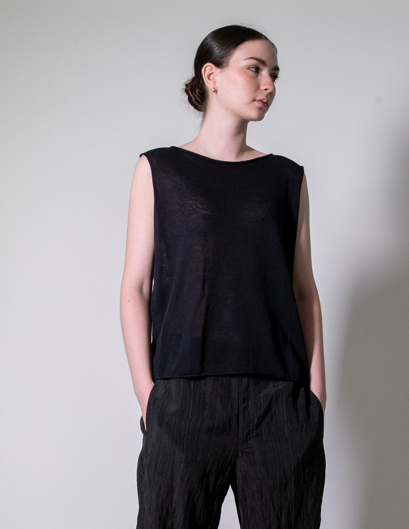A refined sleeveless knitted tank featuring a boat neckline and relaxed body for easy, breathable comfort. Perfect for warm days on its own or layered under a blazer or open shirt for a polished look. Crafted in a lightweight linen-cotton blend knit that embodies understated Italian sophistication.