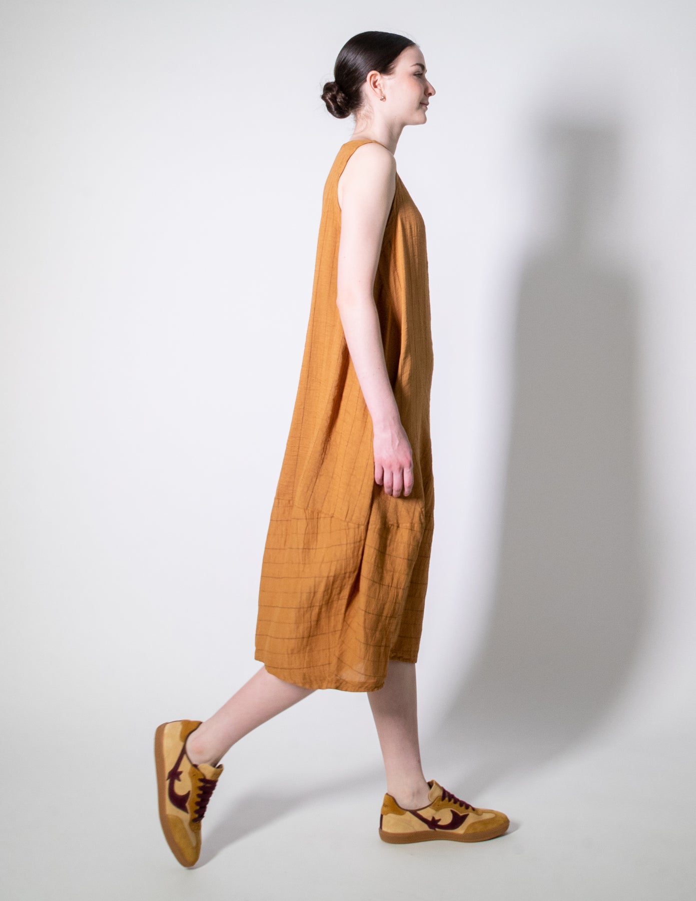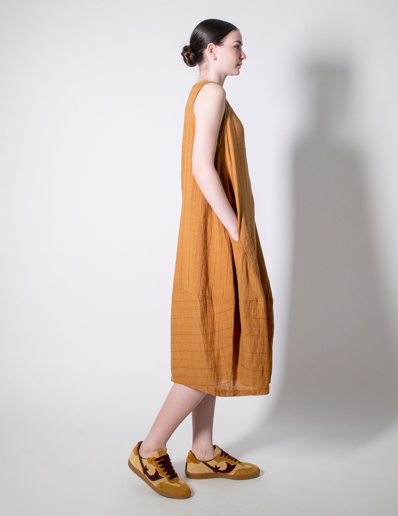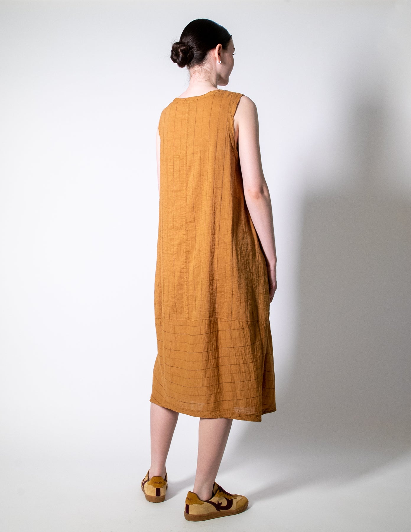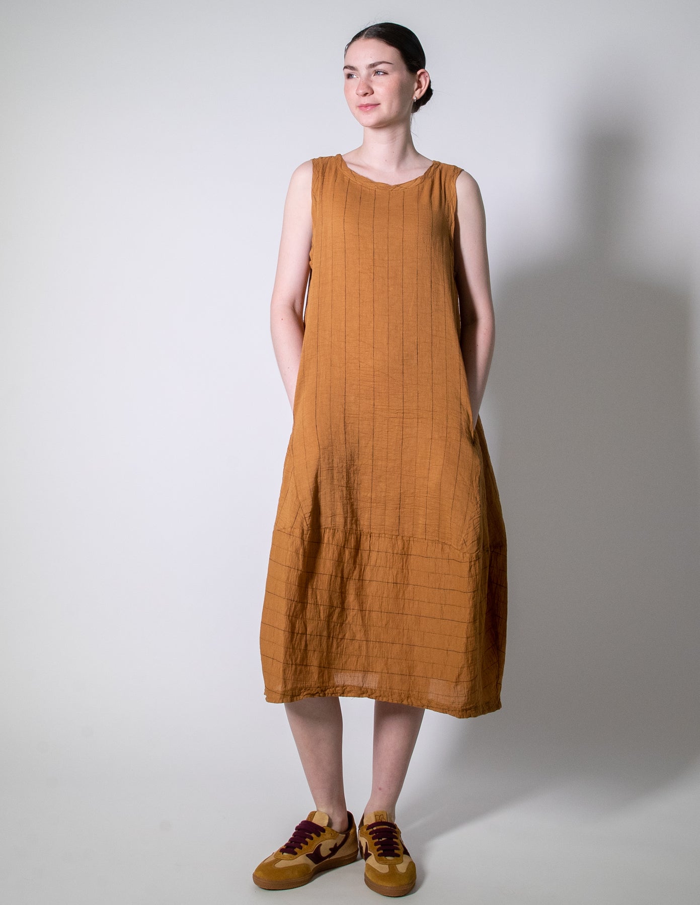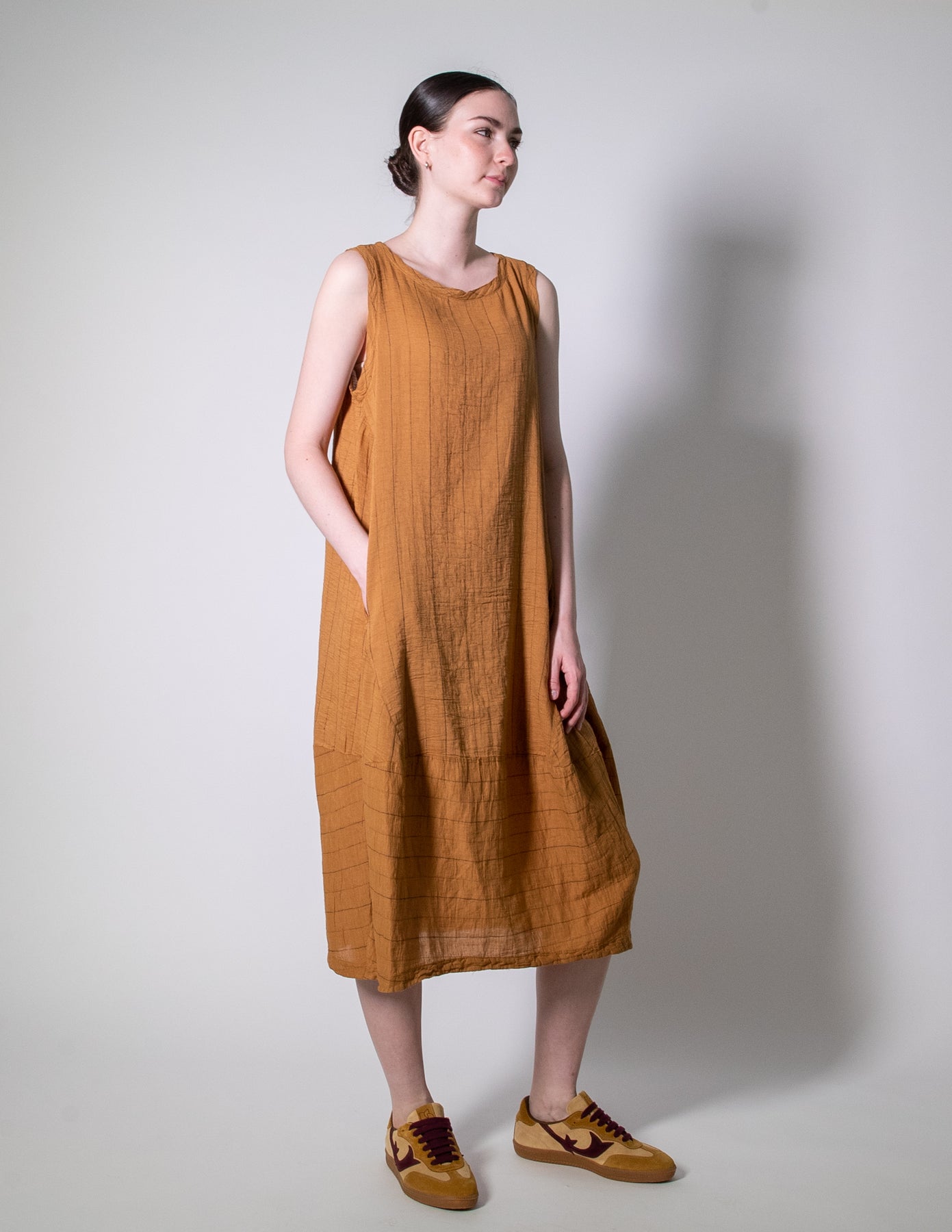 A timeless summer essential crafted in a woven self-stripe linen-cotton blend. This sleeveless dress features a round neckline, front seam pockets, and a relaxed balloon-shaped silhouette with vertical stripe panelling for subtle texture and movement. Easy, breathable, and endlessly wearable for warm days.