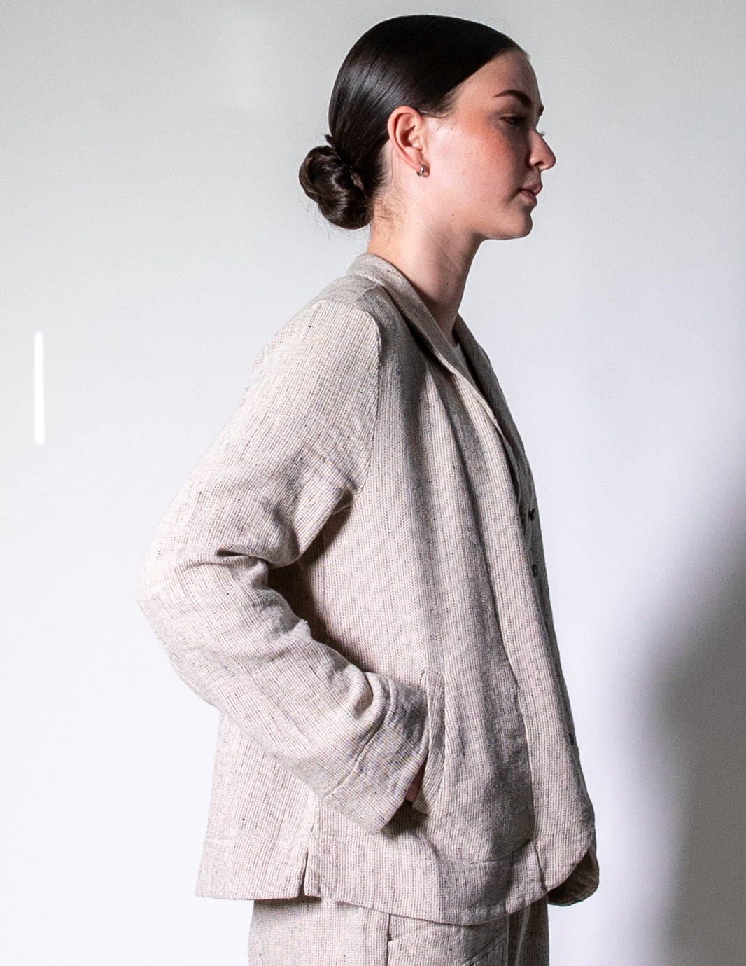 Crafted in Italy from a beautifully soft cotton, linen, and wool woven blend, the Transit Par Such Textural Woven Jacket offers a refined balance of structure and ease. Designed with a form-following silhouette, it features curved seam detailing that subtly shapes the body, enhancing its modern, tailored feel.