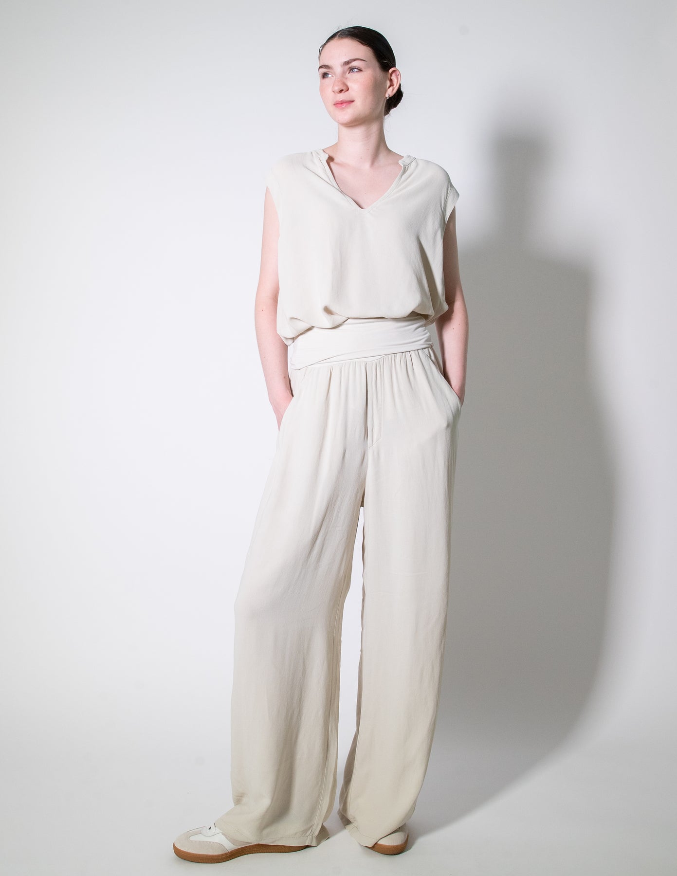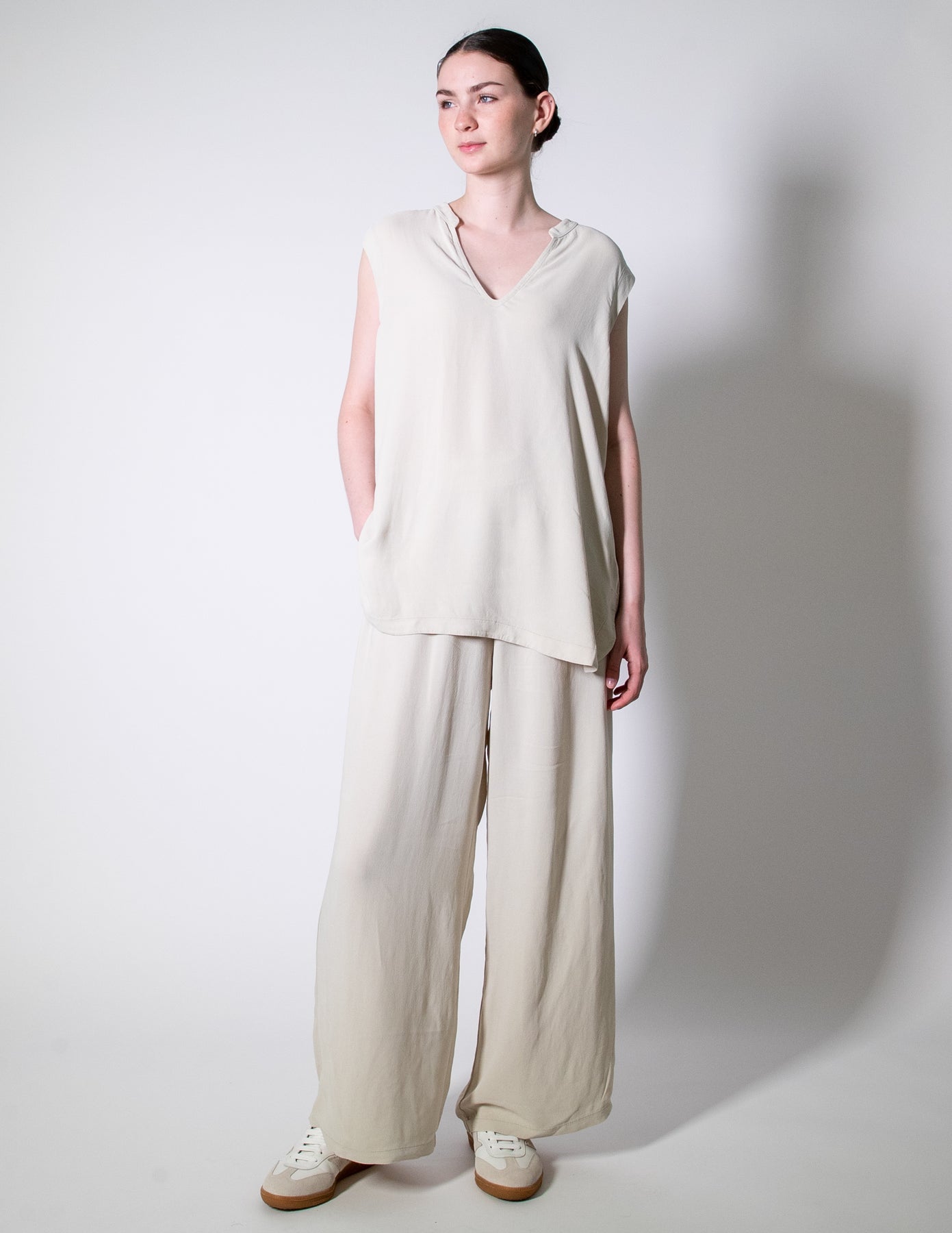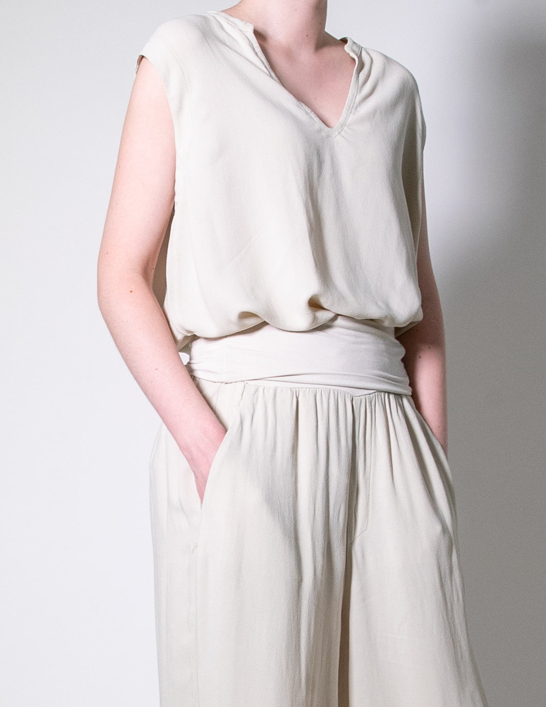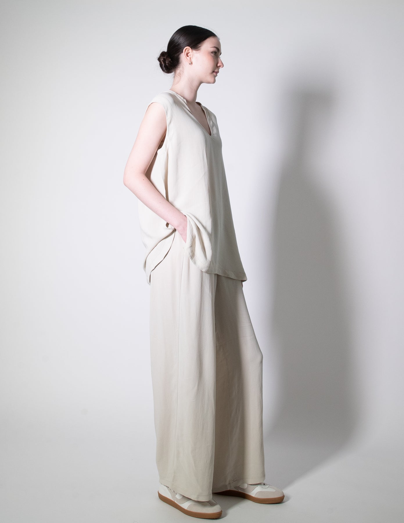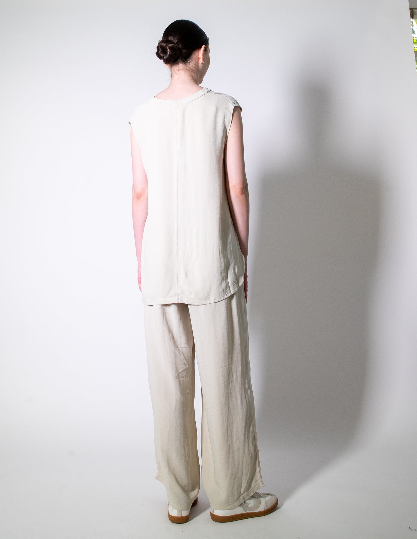 A beautifully textured sleeveless top designed for ease and elegance. Featuring a round neckline that falls into a deep V, a curved hemline, and a relaxed, fluid silhouette that drapes softly on the body. A refined essential that transitions effortlessly from day to evening.